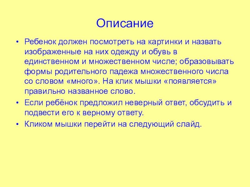 и обувь в единственном и множественном числе; образовывать формы родительного падежа множественного числа со словом «много». На клик мышки «появляется» правильно названное слово.