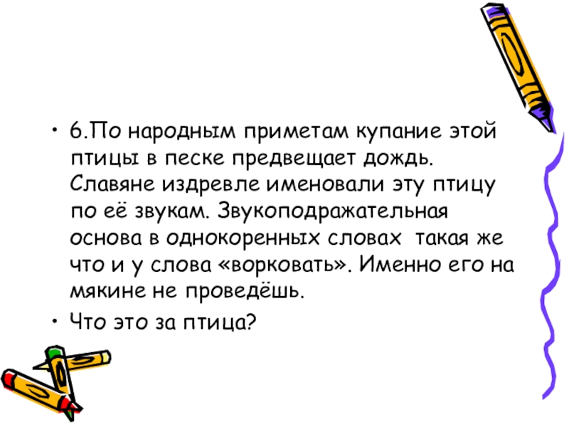 6.По народным приметам купание этой птицы в песке предвещает дождь. Славяне издревле именовали эту птицу по её