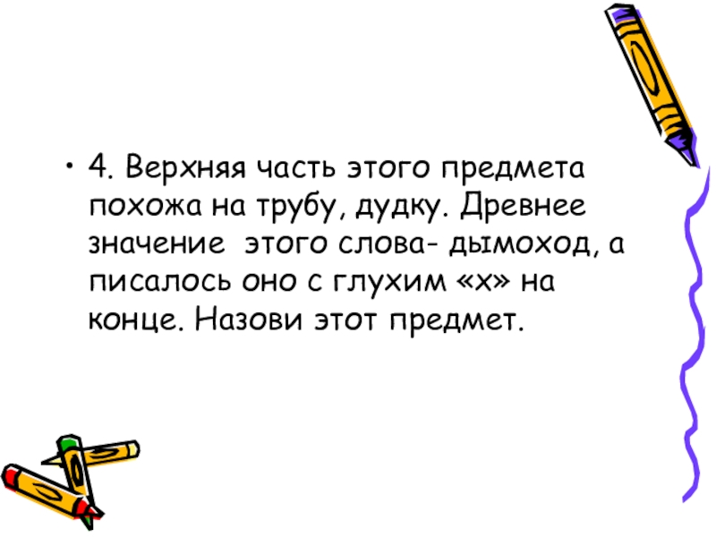 4. Верхняя часть этого предмета похожа на трубу, дудку. Древнее значение этого слова- дымоход, а писалось оно