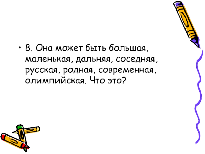 8. Она может быть большая, маленькая, дальняя, соседняя, русская, родная, современная, олимпийская. Что это?