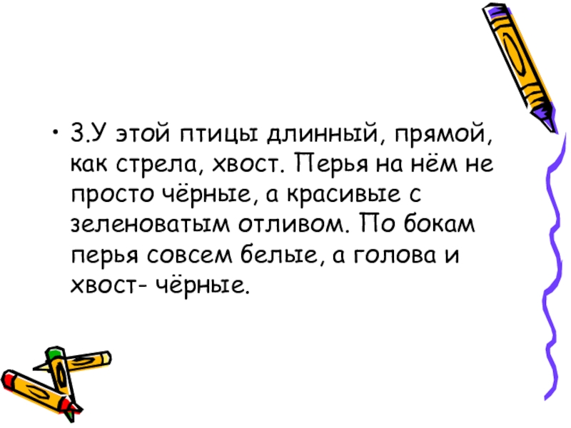 3.У этой птицы длинный, прямой, как стрела, хвост. Перья на нём не просто чёрные, а красивые с