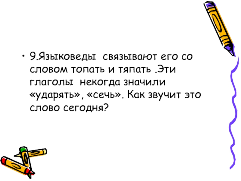 9.Языковеды связывают его со словом топать и тяпать .Эти глаголы некогда значили «ударять», «сечь». Как звучит это