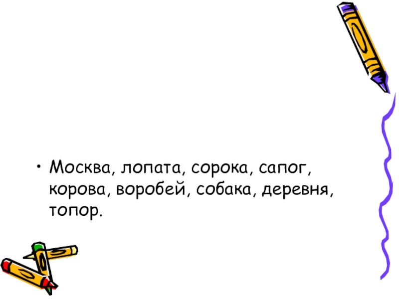 Москва, лопата, сорока, сапог, корова, воробей, собака, деревня, топор.