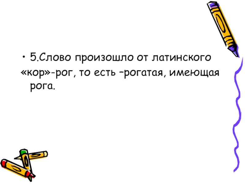 5.Слово произошло от латинского «кор»-рог, то есть –рогатая, имеющая рога.
