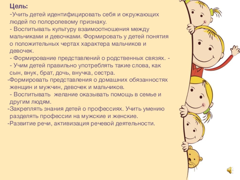 Цель: -Учить детей идентифицировать себя и окружающих людей по полоролевому признаку.- Воспитывать культуру взаимоотношения между мальчиками и девочками. Формировать у детей понятия о положительных чертах характера мальчиков и девочек.- Формирование представлений о родственных связях. -