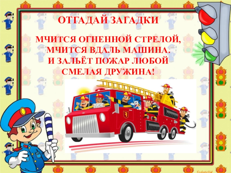 Отгадай загадкиМчится огненной стрелой, Мчится вдаль машина. И зальёт пожар любой Смелая дружина!