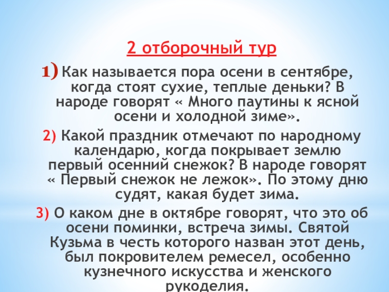 3) О каком дне в октябре говорят, что это об осени поминки, встреча зимы. Святой Кузьма в честь которого назван этот день, был покровителем ремесел, особенно кузнечного искусства и женского рукоделия.