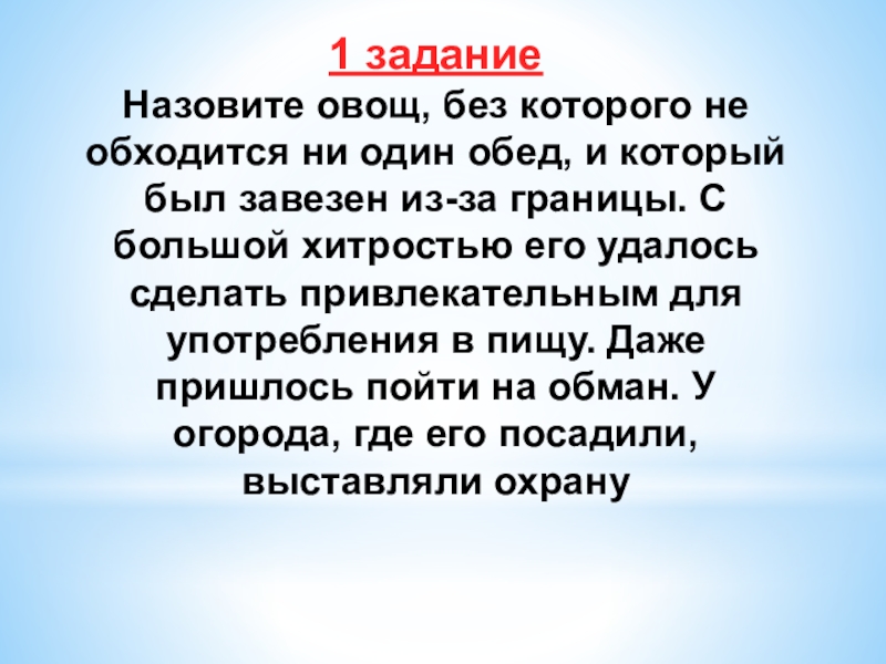 который был завезен из-за границы. С большой хитростью его удалось сделать привлекательным для употребления в пищу. Даже пришлось пойти на обман. У огорода, где его посадили, выставляли охрану