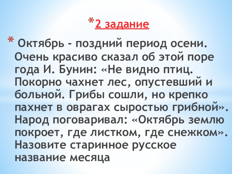 этой поре года И. Бунин: «Не видно птиц. Покорно чахнет лес, опустевший и больной. Грибы сошли, но крепко пахнет в оврагах сыростью грибной». Народ поговаривал: «Октябрь землю покроет, где листком, где снежком». Назовите старинное русское название месяца