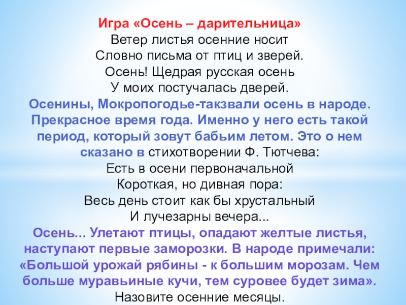 Осень... Улетают птицы, опадают желтые листья, наступают первые заморозки. В народе примечали: «Большой урожай рябины - к большим морозам. Чем больше муравьиные кучи, тем суровее будет зима». Назовите осенние месяцы.