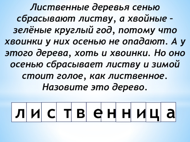 потому что хвоинки у них осенью не опадают. А у этого дерева, хоть и хвоинки. Но оно осенью сбрасывает листву и зимой стоит голое, как лиственное. Назовите это дерево.