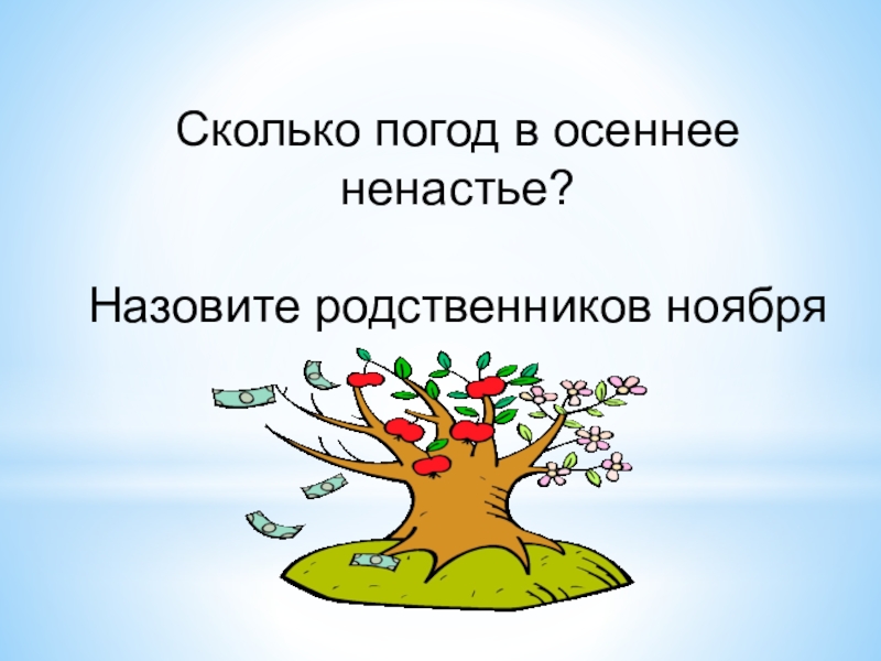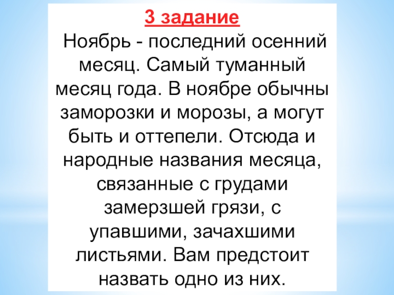 В ноябре обычны заморозки и морозы, а могут быть и оттепели. Отсюда и народные названия месяца, связанные с грудами замерзшей грязи, с упавшими, зачахшими листьями. Вам предстоит назвать одно из них.
