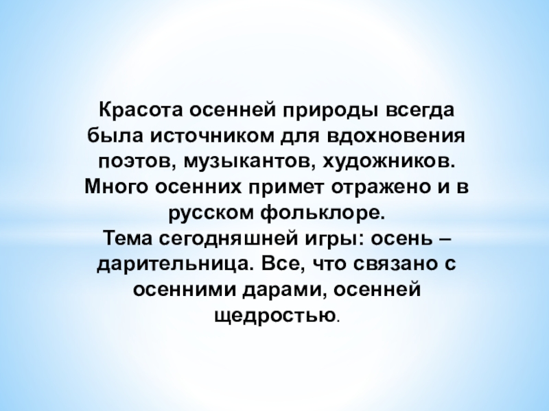 Тема сегодняшней игры: осень – дарительница. Все, что связано с осенними дарами, осенней щедростью.