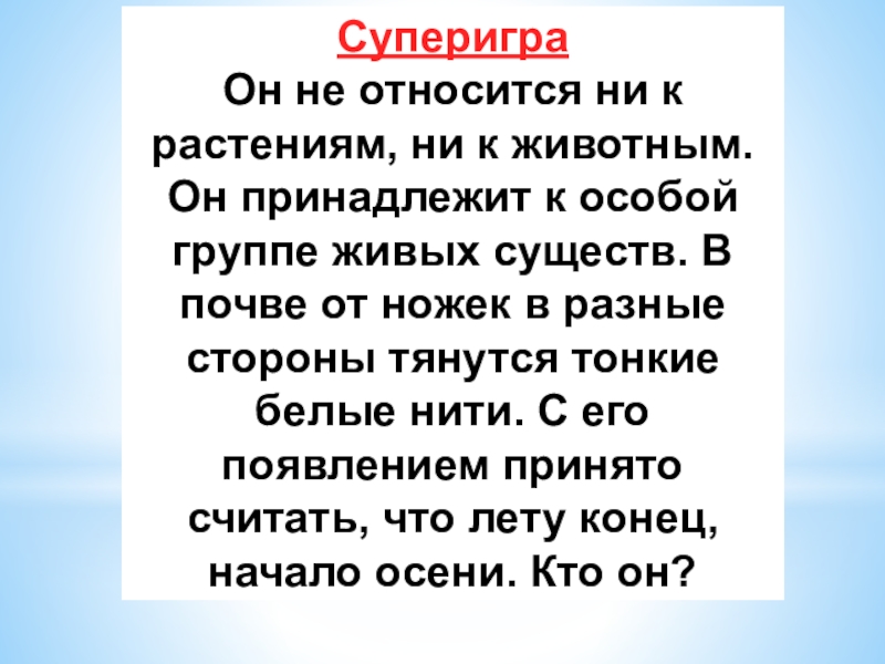к особой группе живых существ. В почве от ножек в разные стороны тянутся тонкие белые нити. С его появлением принято считать, что лету конец, начало осени. Кто он?