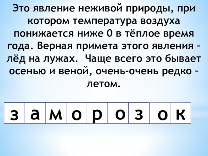 Слайд 25Это явление неживой природы, при котором температура воздуха понижается ниже 0