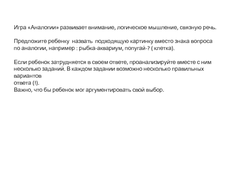 Игра «Аналогии» развивает внимание, логическое мышление, связную речь. Предложите ребенку назвать подходящую картинку вместо знака вопроса по аналогии, например : рыбка-аквариум, попугай-? ( клетка). Если ребенок затрудняется в своем ответе, проанализируйте вместе с ним несколько заданий.