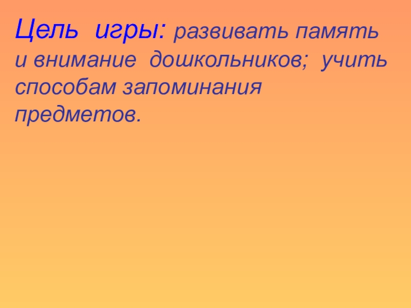 Слайд 2Цель игры: развивать память и внимание  дошкольников; учить способам запоминания предметов.