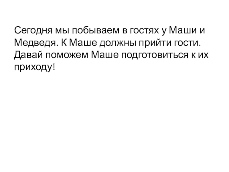 Сегодня мы побываем в гостях у Маши и Медведя. К Маше должны прийти гости. Давай поможем Маше подготовиться к их приходу!