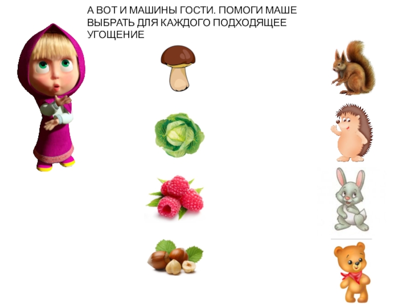 А ВОТ И МАШИНЫ ГОСТИ. ПОМОГИ МАШЕВЫБРАТЬ ДЛЯ КАЖДОГО ПОДХОДЯЩЕЕ УГОЩЕНИЕ