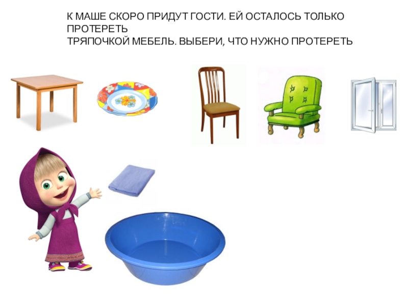 К МАШЕ СКОРО ПРИДУТ ГОСТИ. ЕЙ ОСТАЛОСЬ ТОЛЬКО ПРОТЕРЕТЬТРЯПОЧКОЙ МЕБЕЛЬ. ВЫБЕРИ, ЧТО НУЖНО ПРОТЕРЕТЬ
