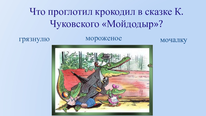 Слайд 10Что проглотил крокодил в сказке К. Чуковского «Мойдодыр»?