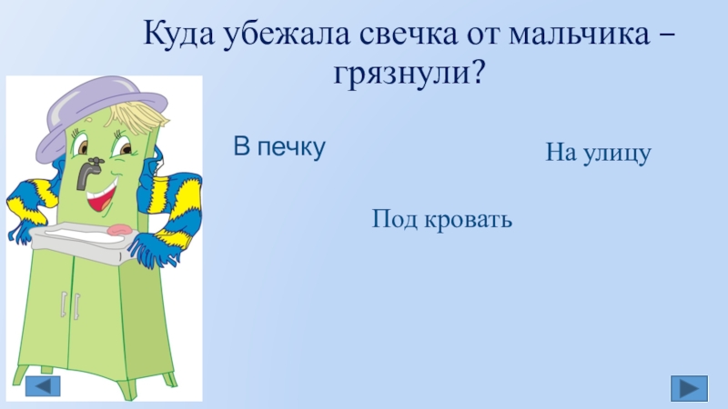 Куда убежала свечка от мальчика – грязнули?В печкуПод кроватьНа улицу