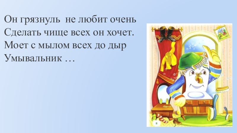 Он грязнуль  не любит оченьСделать чище всех он хочет.Моет с мылом всех до дырУмывальник …