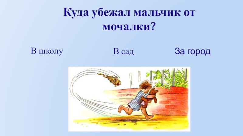 Куда убежал мальчик от мочалки? В школуВ садЗа город
