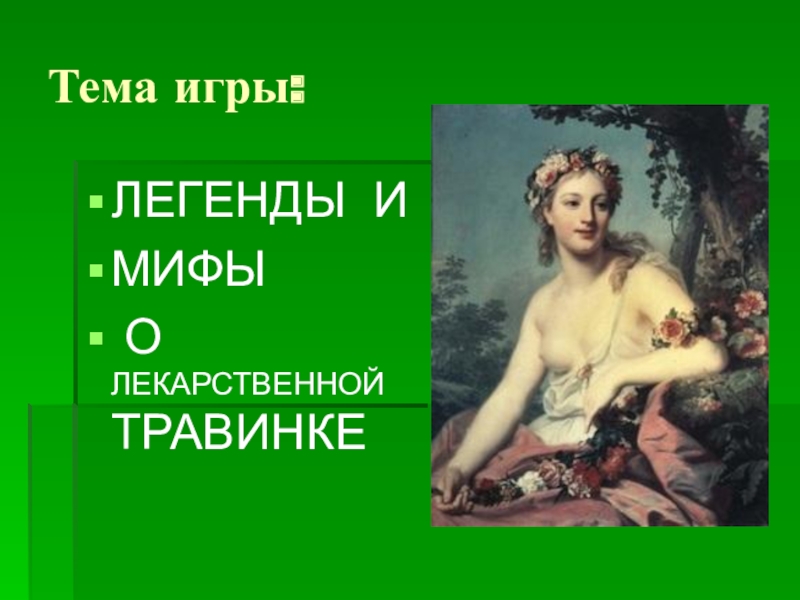 Тема игры:ЛЕГЕНДЫ И МИФЫ О ЛЕКАРСТВЕННОЙ ТРАВИНКЕ