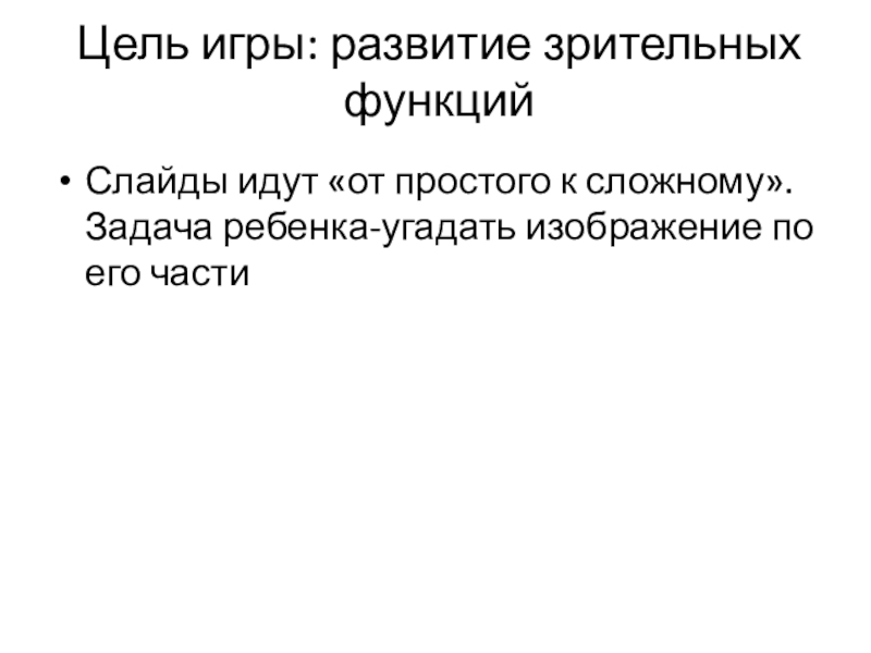 Цель игры: развитие зрительных функцийСлайды идут «от простого к сложному». Задача ребенка-угадать изображение по его части