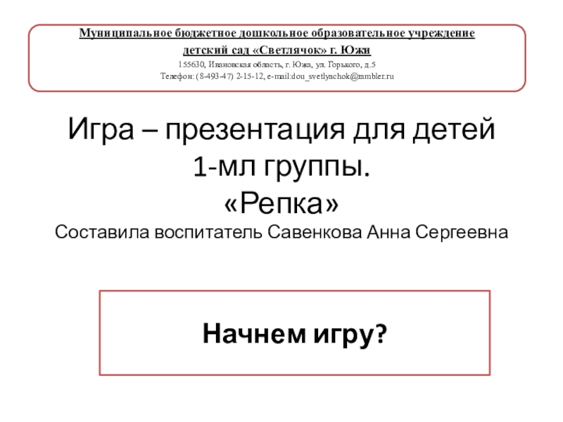 Телефон: (8-493-47) 2-15-12, e-mail:dou_svetlyachok@rambler.ru