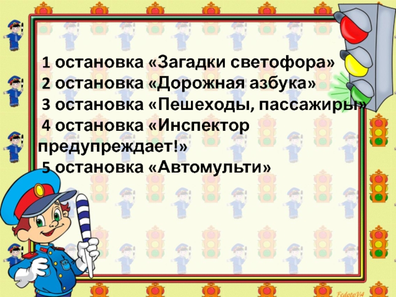 1 остановка «Загадки светофора» 2 остановка «Дорожная азбука» 3 остановка «Пешеходы, пассажиры» 4 остановка «Инспектор предупреждает!» 5 остановка «Автомульти»