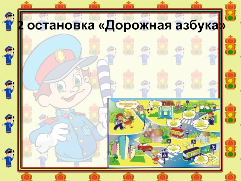 Слайд 2 1 остановка «Загадки светофора» 2 остановка «Дорожная азбука» 3 остановка