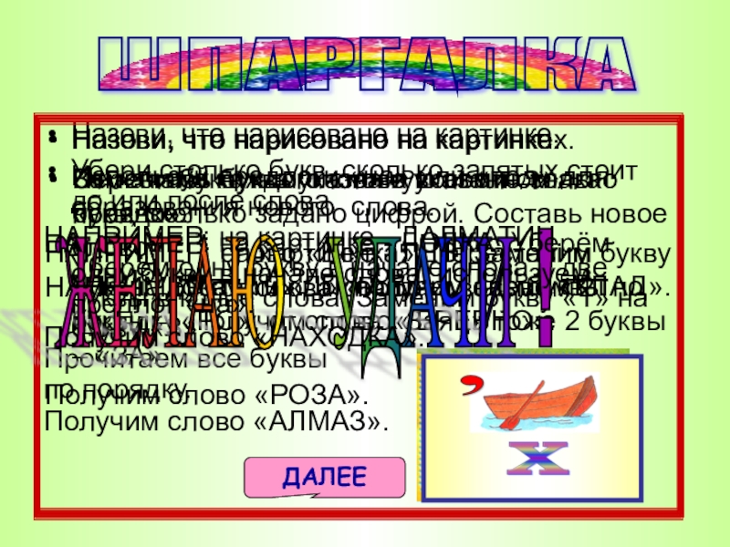 НАПРИМЕР: на картинке - ЛОДКА. Уберём одну букву в начале слова, используем предлог «на».