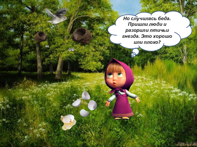 Слайд 20Но случилась беда. Пришли люди и разорили птичьи гнезда. Это хорошо