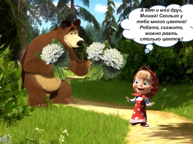 А вот и мой друг, Мишка! Сколько у тебя много цветов! Ребята, скажите, можно рвать столько цветов?