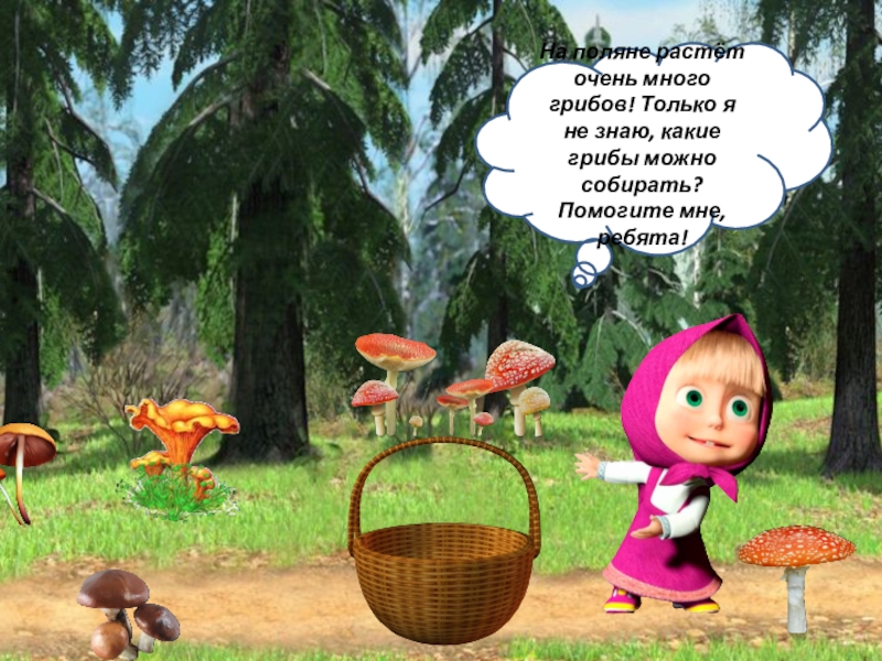 На поляне растёт очень много грибов! Только я не знаю, какие грибы можно собирать? Помогите мне, ребята!