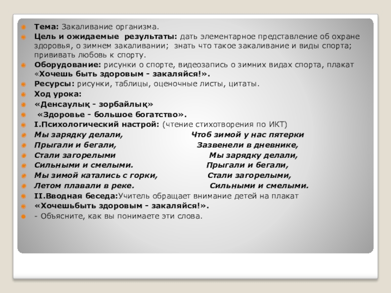 Оборудование: рисунки о спорте, видеозапись о зимних видах спорта, плакат «Хочешь быть здоровым - закаляйся!».
