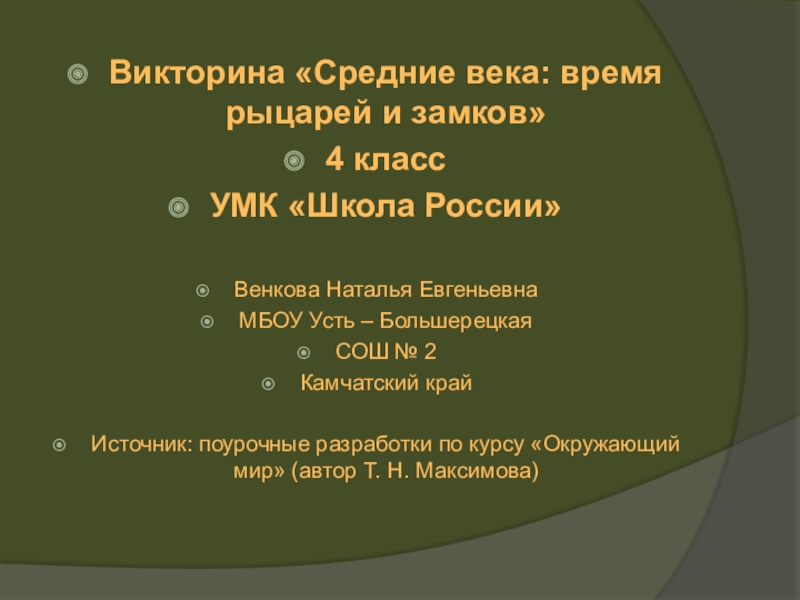 Викторина «Средние века: время рыцарей и замков»4 классУМК «Школа России»Венкова Наталья ЕвгеньевнаМБОУ Усть – БольшерецкаяСОШ № 2Камчатский