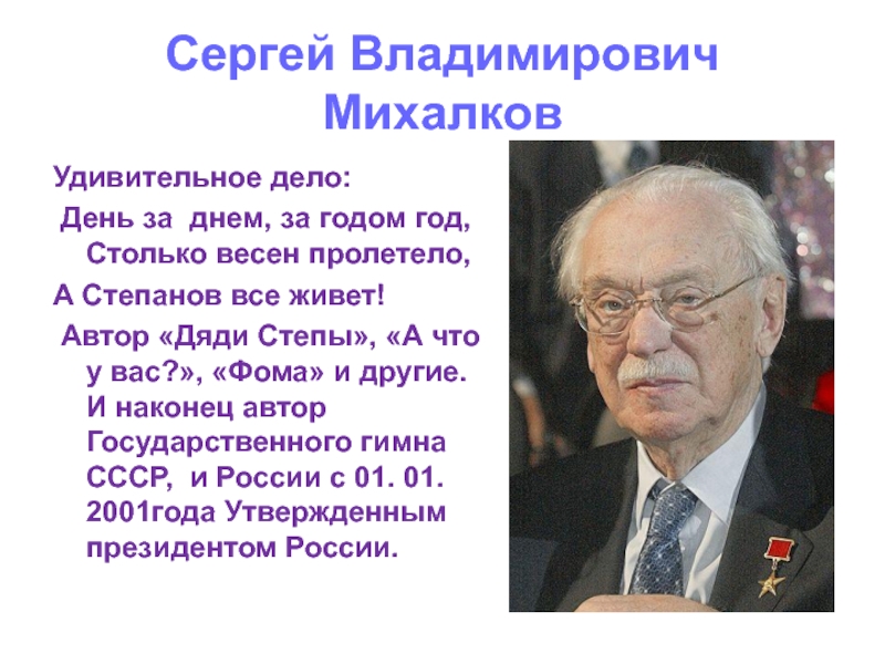 Автор «Дяди Степы», «А что у вас?», «Фома» и другие. И наконец автор Государственного гимна СССР, и России с 01. 01. 2001года Утвержденным президентом России.