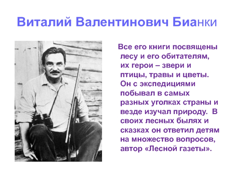 обитателям, их герои – звери и птицы, травы и цветы. Он с экспедициями побывал в самых разных уголках страны и везде изучал природу. В своих лесных былях и сказках он ответил детям на множество вопросов, автор «Лесной газеты».