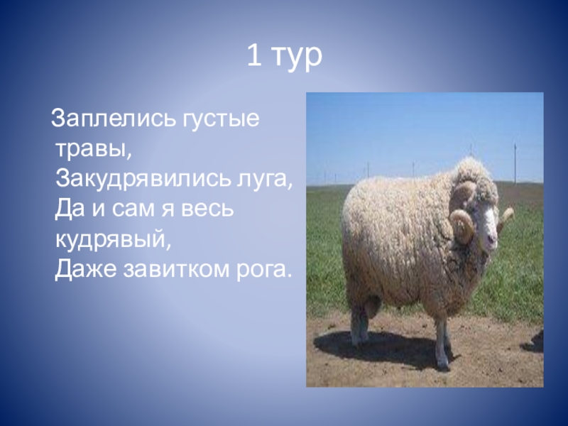 1 тур Заплелись густые травы, Закудрявились луга, Да и сам я весь кудрявый, Даже завитком рога.