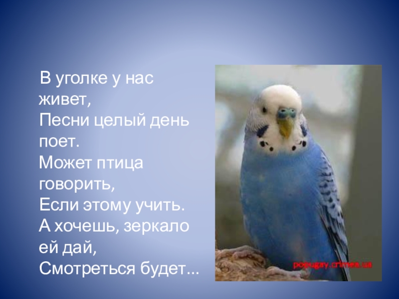 В уголке у нас живет, Песни целый день поет. Может птица говорить, Если этому учить.