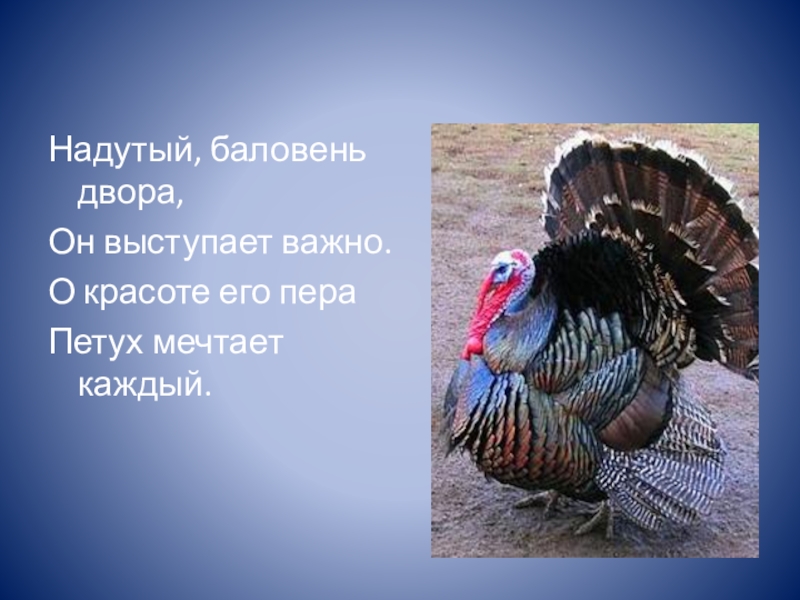 Надутый, баловень двора,Он выступает важно.О красоте его пераПетух мечтает каждый.