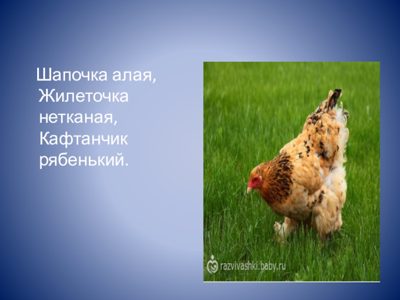 Слайд 12 Шапочка алая,  Жилеточка нетканая,  Кафтанчик рябенький.