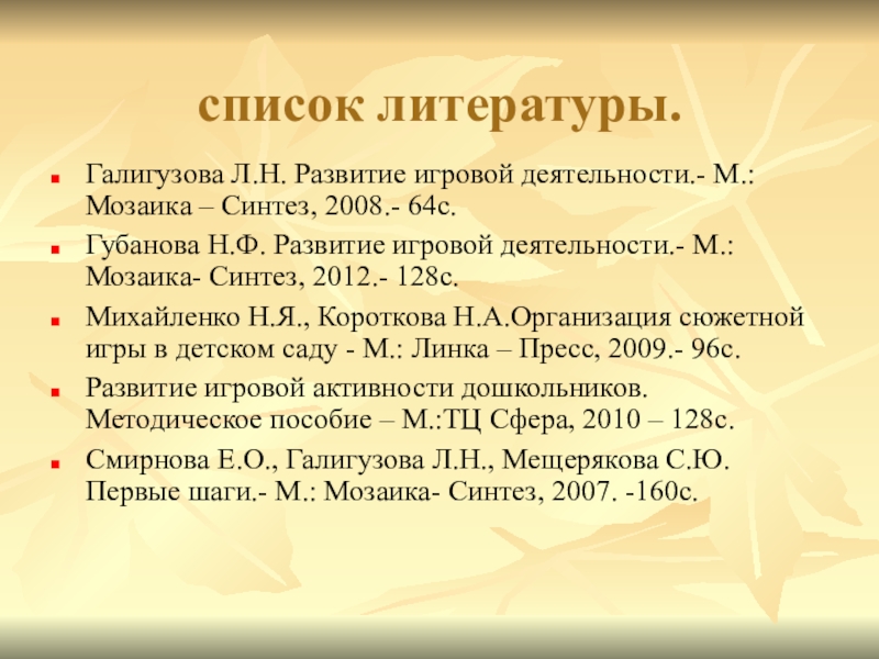 Галигузова Л.Н. Развитие игровой деятельности.- М.: Мозаика – Синтез, 2008.-