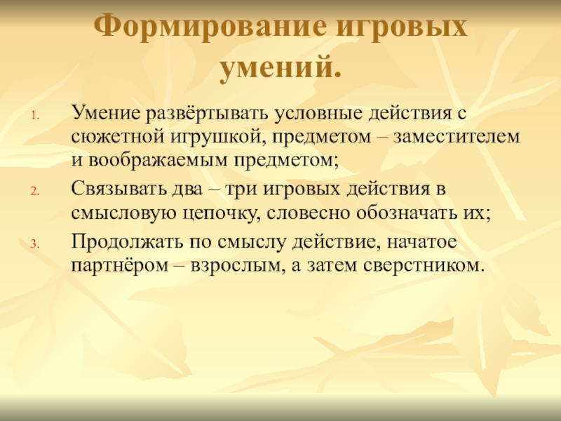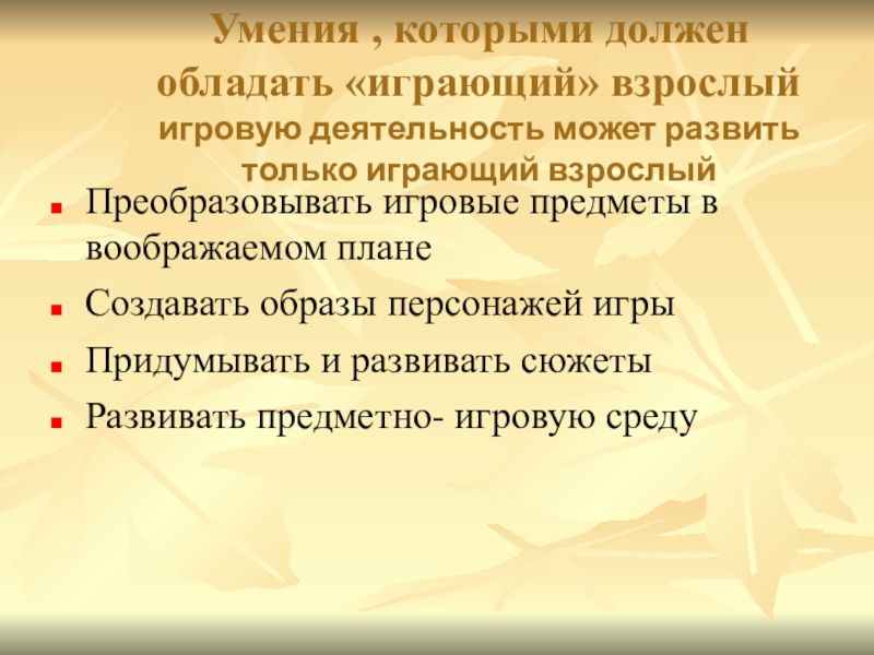 Слайд 7Умения , которыми должен обладать «играющий» взрослый