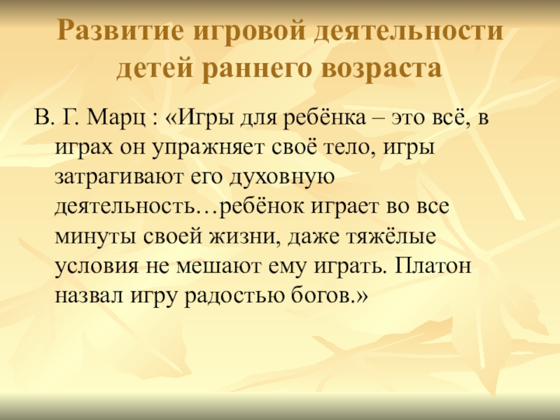 ребёнка – это всё, в играх он упражняет своё тело, игры затрагивают его духовную деятельность…ребёнок играет во все минуты своей жизни, даже тяжёлые условия не мешают ему играть. Платон назвал игру радостью богов.»