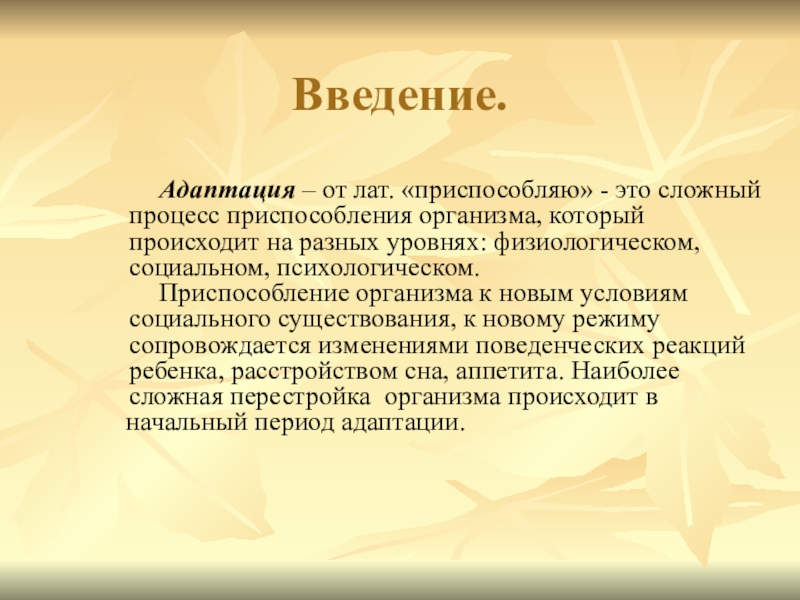 это сложный процесс приспособления организма, который происходит на разных уровнях: физиологическом, социальном, психологическом.