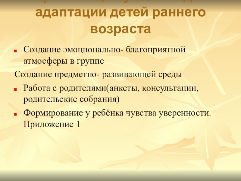 Слайд 26Организация условий для адаптации детей раннего возраста